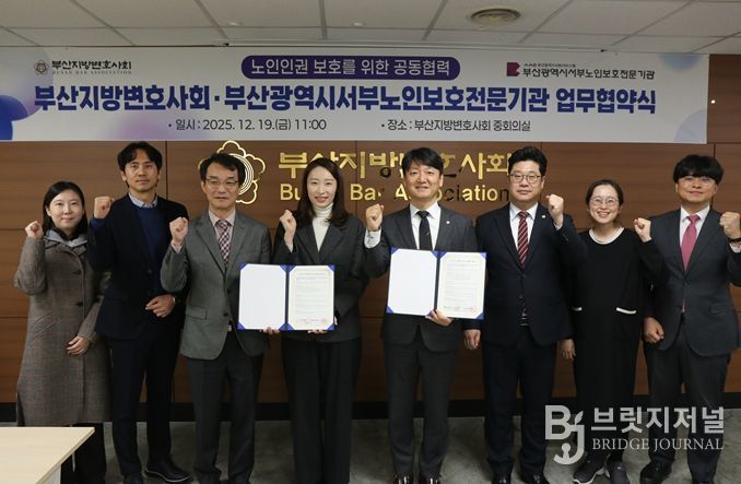 브릿지저널 윤나영 기자 | 서부노인보호전문기관은 2025년 12월 19일 오전 10시 30분, 부산광역시사회서비스원, 부산지방변호사회과 함께 부산지방변호사회 회의실에서 관계자 8명이 참석한 가운데 노인인권보호 공동협력 협약을 체결했다.