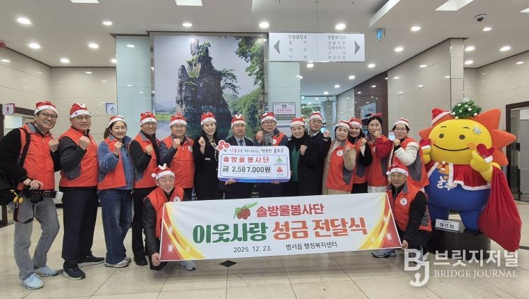 브릿지저널 윤나영 기자 | 솔방울봉사단(단장 이해준)이 23일 울주군 범서읍 행정복지센터에서 지역 취약계층을 위한 이웃돕기 성금 258만7천원을 전달했다.