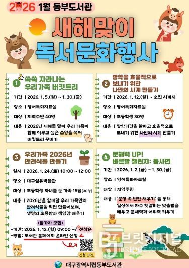 브릿지저널 김진석 기자 | 대구동부도서관은 다가오는 새해를 맞아 지역주민이 도서관에서 뜻깊은 한 해를 시작할 수 있도록 1월 한 달간 동부도서관 ‘새해맞이 특별 독서문화행사’를 운영한다.