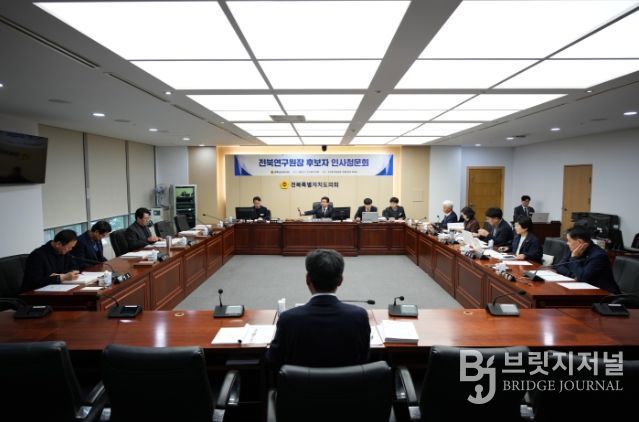 브릿지저널 윤나영 기자 | 전북특별자치도의회 인사청문특별위원회는 23일 의회운영위원회 회의실에서 전북연구원 원장 최백렬 후보자에 대한 전문성과 도덕성을 검증하는 인사청문회를 실시했다.