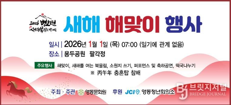브릿지저널 김경미 기자 | 영동문화원은 내년 1월 1일 오전 7시, 용두공원 팔각정 앞에서 군민의 소망 성취와 지역의 번영을 기원하는 ‘2026 신년 해맞이 행사’를 개최할 예정이다.