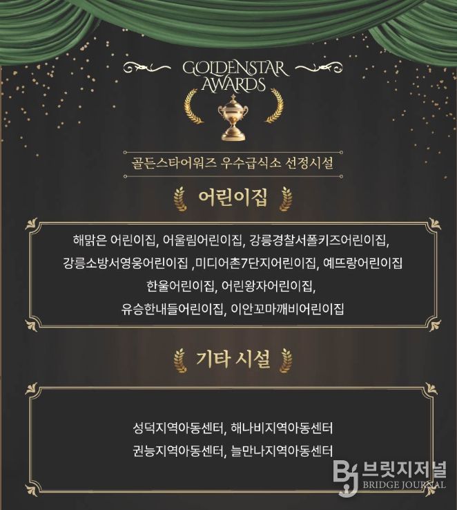 브릿지저널 윤나영 기자 | 강릉시 어린이·사회복지급식관리지원센터는 관내 어린이집·유치원 및 기타 시설을 대상으로 2025년 한 해 동안 센터에서 운영한 사업과 프로그램에 적극 참여하고 위생·영양·안전관리 실천 수준이 우수한 14개소 급식소를 '우수급식소 골든스타어워즈'로 선정하여 우수기관 인증 현판을 전달했다.