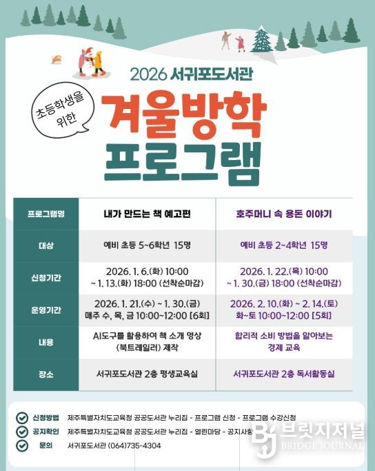 브릿지저널 정보영 기자 | 제주도교육청 서귀포도서관은 겨울방학을 맞아 어린이들의 호기심을 자극해 책 읽기의 즐거움과 경제 감각을 키우는 겨울방학 프로그램을 운영하며, 내년 1월 6일부터 참가자를 모집한다.