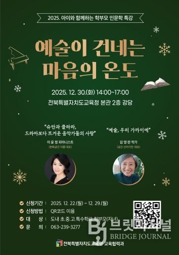 브릿지저널 윤나영 기자 | 전북특별자치도교육청은 30일 오후 2시 2층 강당에서 ‘아이와 함께하는 학부모 인문학 특강’을 개최한다.
