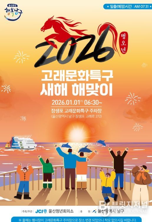브릿지저널 윤나영 기자 | 울산 남구는 울산청년회의소(회장 정래희)와 함께 2026년 새해 해맞이 행사를 장생포 고래문화특구 주차장에서 개최한다.