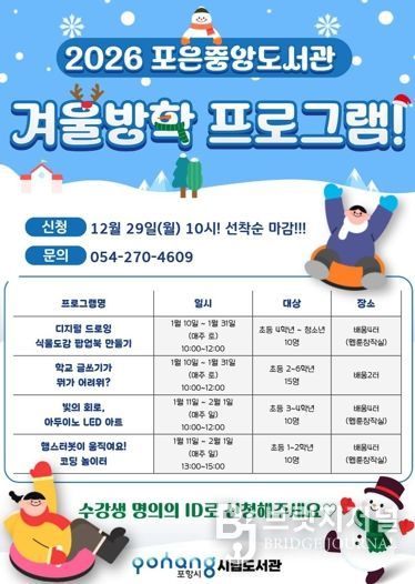 브릿지저널 정보영 기자 | 포항시립포은중앙도서관은 내년 1월 10일부터 시작되는 겨울방학 프로그램의 수강생을 29일 오전 10시부터 포항시립도서관 홈페이지에서 사전 접수한다.