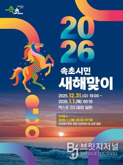브릿지저널 윤나영 기자 | 속초시가 병오년 ‘붉은 말의 해’를 맞아 12월 31일(수) 저녁 7시부터 엑스포 잔디광장 일원에서 ‘2026 속초시민 새해맞이 행사’를 개최한다. 다채로운 프로그램이 이어지며 시민의 안녕과 희망찬 새해 출발을 기원하는 화합의 시간이 될 전망이다.