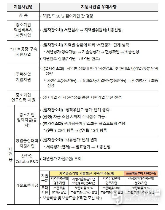 또한 정책자금, 창업·성장, R&D, 보증 분야에는 선정 절차 간소화, 평가 면제 또는 가점 부여, 지원한도 상향, 보증조건 우대 등 현장의 의견을 반영한 다양한 제도개선 사항이 적용된다.
