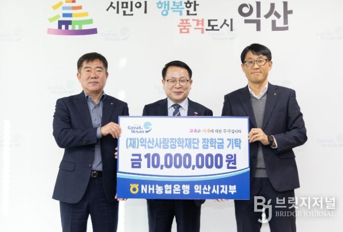 NH농협은행 익산시지부(지부장 진현욱)는 30일 (재)익산사랑장학재단(이사장 정헌율)에 장학금 1,000만 원을 기탁했다.