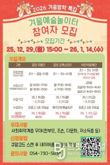브릿지저널 정보영 기자 | 재단법인 영덕문화관광재단은 겨울방학을 맞아 2026년 1월부터 2월까지 아동·청소년을 대상으로 운영하는 '겨울예술놀이터'의 참여자를 모집한다고 밝혔다.