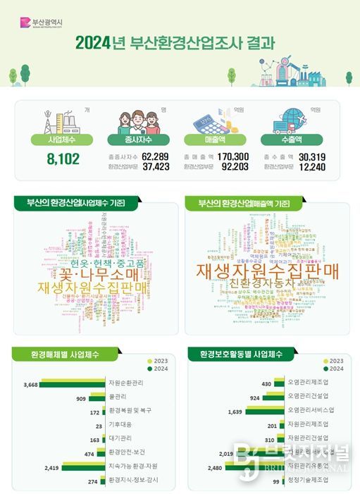 부산의 환경산업이 지난 5년간 규모 면에서 사업체(34.9% 증가)와 고용(29.0% 증가)이 크게 늘었을 뿐만 아니라, 사업체당 매출액이 11.38억 원으로 2020년(8.98억 원)보다 26.7퍼센트(%) 증가하는 등 질적 성장도 이룬 것으로 나타났다.