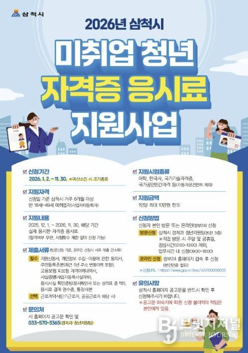 브릿지저널 윤나영 기자 | 삼척시는 미취업 청년의 자격증 취득에 따른 경제적 부담을 완화하고 취업역량 강화를 지원하기 위해 '2026년 삼척시 미취업 청년 자격증 응시료 지원사업'을 추진한다고 밝혔다.