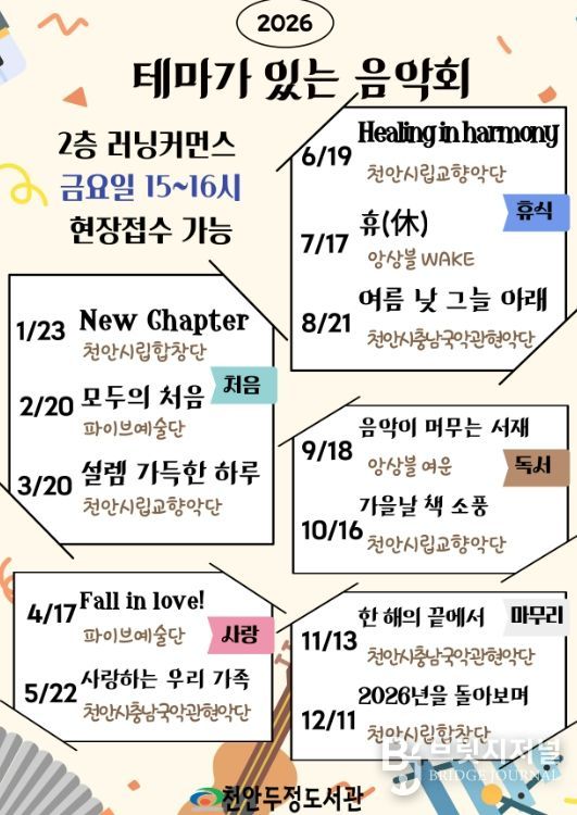 브릿지저널 정보영 기자 | 천안시 두정도서관은 내년부터 ‘테마가 있는 음악회’를 운영한다고 31일 밝혔다.