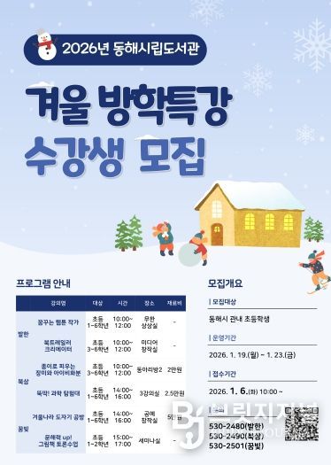 브릿지저널 윤나영 기자 | 동해시는 2026년 겨울방학을 맞아 관내 초등학생을 대상으로 동해시립도서관에서 겨울방학 특강 프로그램을 운영한다고 밝혔다.