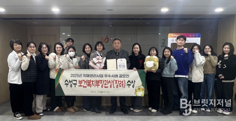 브릿지저널 김진석 기자 | 대구 수성구 치매안심센터(센터장 여수환)는 보건복지부와 중앙치매센터가 공동주최한 ‘2025년 치매관리사업 우수사례 공모전’에서 ‘치매환자 및 보호자 지원’ 분야의 우수성을 인정받아 보건복지부장관상을 수상했다고 밝혔다.