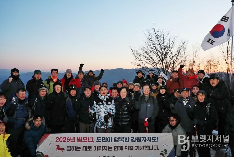 브릿지저널 윤나영 기자 | 김진태 강원특별자치도지사는 2026년 1월 1일 새해 첫 일정으로 도청 실국장 및 직원 30여 명과 함께 금병산에서 해맞이 산행을 진행했다.