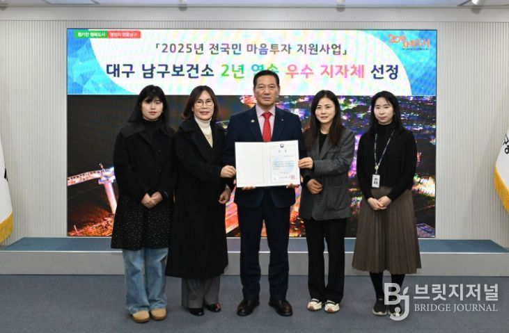 브릿지저널 김진석 기자 | 대구 남구가 보건복지부가 주관한 ‘2025년 전국민 마음투자 지원사업 유공자 및 우수지자체 포상’에서 2년 연속 우수상을 수상했다.