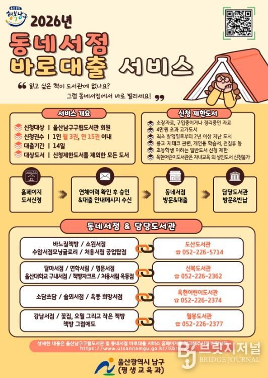 브릿지저널 윤나영 기자 | 울산 남구는 2026년'동네서점 바로대출'서비스를 1월 2일부터 운영한다고 밝혔다.