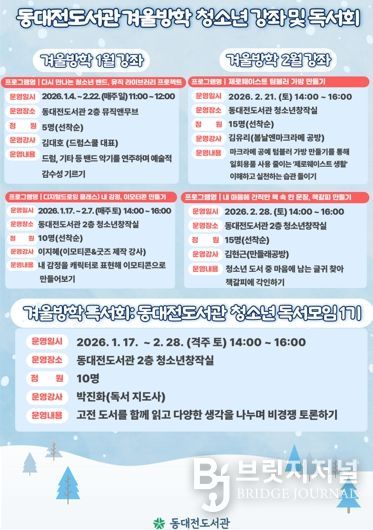 브릿지저널 정보영 기자 | 동대전도서관은 겨울방학을 맞아 오는 1월 4일부터 2월 28일까지 청소년을 대상으로 독서회 및 창작 체험 강좌를 운영한다.