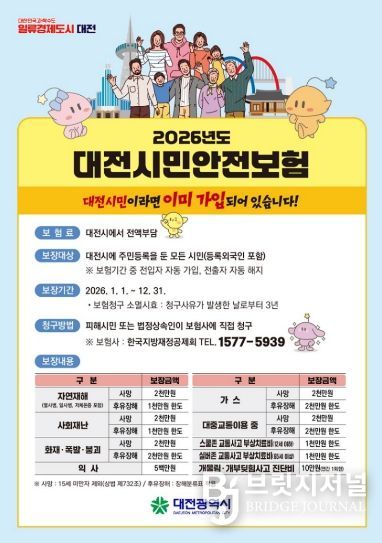 브릿지저널 정보영 기자 | 대전시는 각종 재난․사고로부터 시민의 생활안전을 지원하기 위해 운영 중인 시민안전보험의 보장 항목을 올해부터 확대 운영한다.