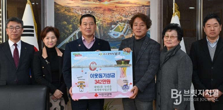 브릿지저널 김진석 기자 | 대구 남구는 대명3동 뉴타운 재개발사업 조합의 조합장(이대룡)을 비롯한 임원, 대의원 및 직원이 지난 2025년 12월 30일 연말을 맞아 어려운 이웃을 위해 써달라며 정성껏 모은 성금 342만원을 기탁했다고 밝혔다.