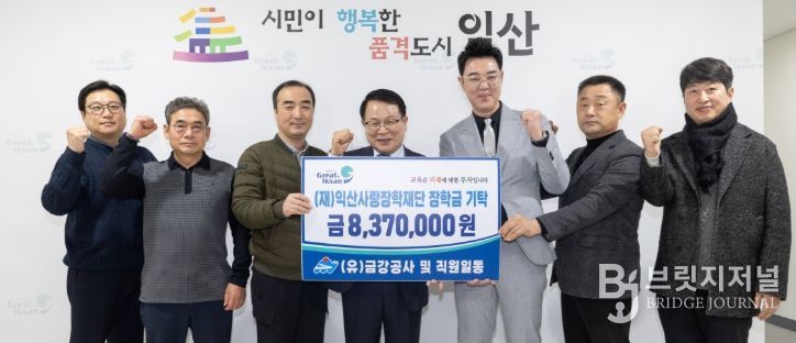 익산시 향토기업인 금강공사(대표이사 최은규)는 6일 시청을 방문해 (재)익산사랑장학재단에 장학금 837만 원을 기탁했다.