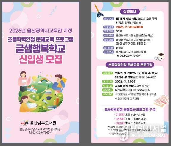 브릿지저널 윤나영 기자 | 울산남부도서관은 배움의 시기를 놓친 성인들에게 정규 학력 취득의 기회를 제공하는 문해교육 프로그램 ‘글샘행복학교’의 신입생을 모집한다.