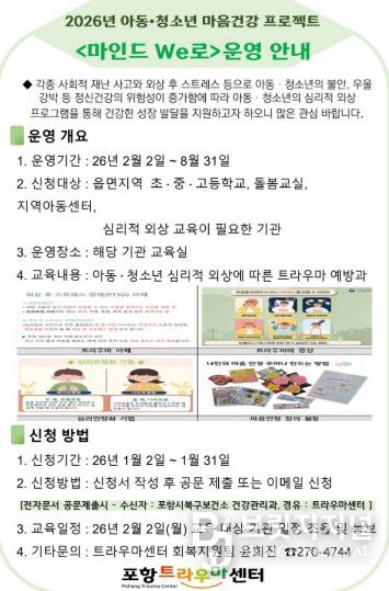 한편, 포항시 트라우마센터는 시민을 위한 심리상담, 전문 치유 장비 체험 등 다양한 회복 프로그램을 상시 운영하고 있다. 자세한 내용은 센터로 문의 또는 홈페이지에서 확인할 수 있다.