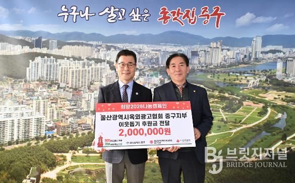 브릿지저널 윤나영 기자 | 울산광역시옥외광고협회 중구지부가 1월 8일 오전 10시 30분 중구청 구청장실을 방문해 울산사회복지공동모금회를 통해 이웃돕기 후원금 200만 원을 전달했다.