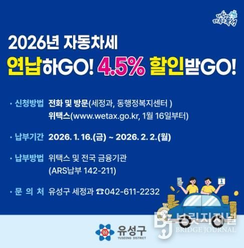 납부 대상은 2026년 1월 기준 자동차등록원부상 관내 차량 소유자 중 지난해 연납했던 기존 납세자와 신규 신청자로, 연납 신청은 오는 16일부터 유성구청 세정과·동 행정복지센터에 전화 또는 방문하거나 위택스에서 가능하다.