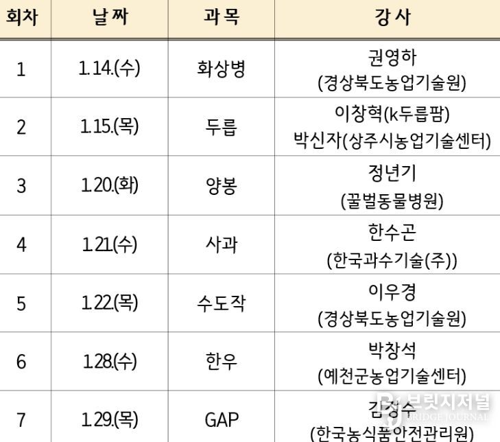 일정과 과목은 14일 화상병 과정을 시작으로, 15일 두릅, 20일 양봉, 21일 사과, 22일 수도작, 28일 한우, 29일 GAP과정까지 총 7개 과정으로 이뤄진다.