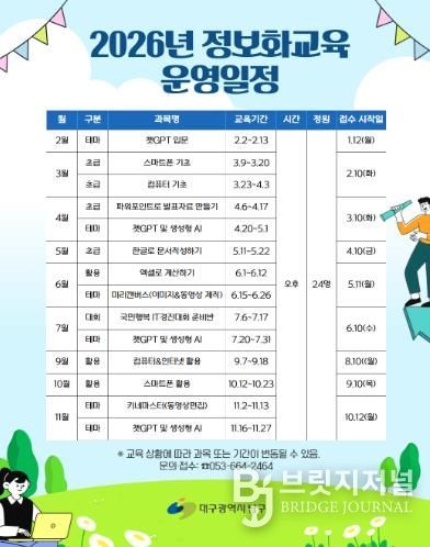 브릿지저널 김진석 기자 | 대구 남구는 구민을 대상으로 2026년 정보화교육을 실시한다고 밝혔다.