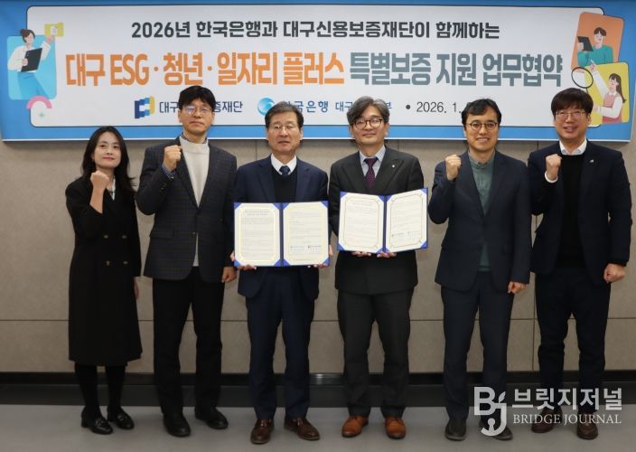 브릿지저널 김진석 기자 | 대구신용보증재단이 지역경제 성장과 중소기업·소상공인의 경영 안정을 도모하기 위해 한국은행 대구경북본부와 ‘대구 ESG·청년·일자리 특별보증’을 시행한다고 밝혔다.