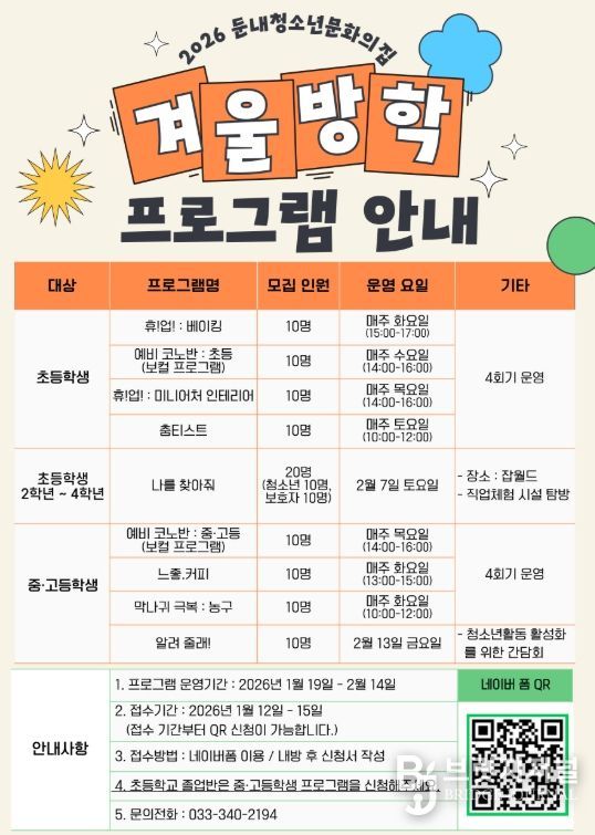 브릿지저널 윤나영 기자 | 둔내청소년문화의집이 다가오는 겨울방학을 맞아 지역 청소년들의 소질 계발과 유익한 여가 선용을 위한 ‘2026년 겨울방학 프로그램’ 수강생을 모집한다.