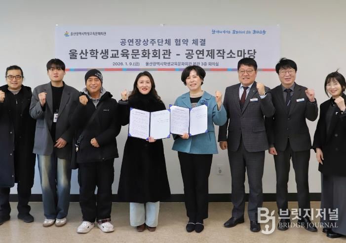 울산학생교육문화회관은 지난 9일 회관 내 회의실에서 지역 공연예술 단체인 ‘공연제작소 마당’과 지역 예술교육 활성화를 위한 업무협약을 맺었다.