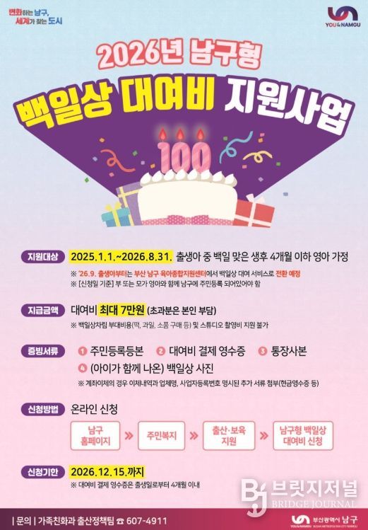 브릿지저널 윤나영 기자 | 부산 남구가 소중한 아이의 백일을 뜻깊게 기념할 수 있도록 '2026년 남구형 백일상 대여비 지원사업'을 추진한다고 밝혔다.