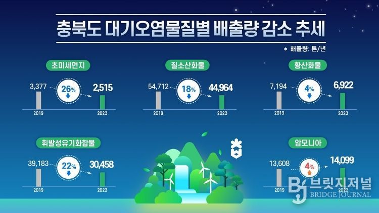 브릿지저널 김경미 기자 | 충북도는 ’23년 대기오염물질 배출량이 `19년 대비 큰 폭으로 감소했다고 밝혔다.