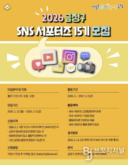 브릿지저널 윤나영 기자 | 부산시 금정구가 구민들과의 온라인 소통 확대를 위한 SNS 서포터즈를 모집한다.