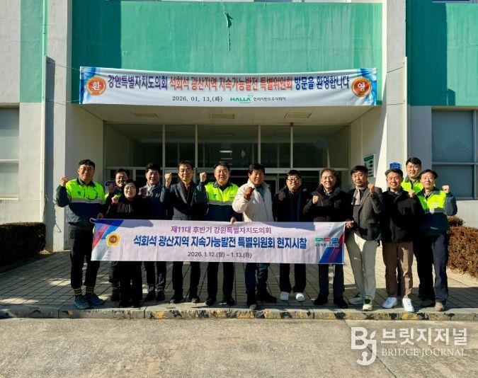 브릿지저널 윤나영 기자 | 강원특별자치도의회 석회석 광산지역 지속가능발전 특별위원회는 1월 12일부터 13일까지 동해 쌍용씨앤이·삼척 삼표시멘트·강릉 한라시멘트 등 시멘트 산업 및 광산지역 현장을 방문해, 석회석 자원을 기반으로 한 광산지역의 지속가능한 발전 방향과 지역 상생 방안을 점검했다.