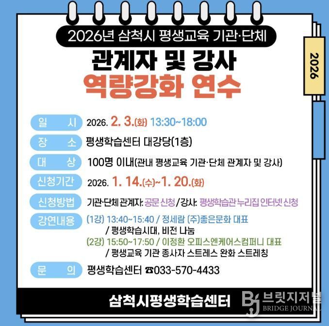 브릿지저널 윤나영 기자 | 삼척시는 관내 평생교육 기관·단체 관계자와 강사를 대상으로 촘촘한 교육복지 실현을 위한 ‘2026년 삼척시 평생교육 기관·단체 관계자 및 강사 역량강화 연수’를 개최한다.