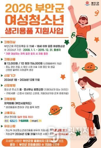 부안군 관계자는 “여성청소년 생리용품 지원은 신청한 달부터 지원받을 수 있으므로, 특히 1월 집중신청기간에 대상 청소년들이 빠짐없이 혜택을 받을 수 있기를 바란다”고 말했다.