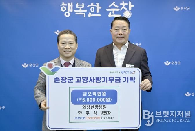 브릿지저널 윤나영 기자 | 의성한방병원을 운영하는 한주석 병원장이 최근 순창군을 방문해 500만원의 고향사랑기부금을 전달했다.
