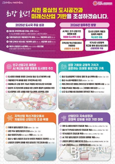 브릿지저널 윤나영 기자 | 울산시가 ‘최강 울산!’ 완성을 위한 시민 중심의 도시공간 조성과 미래 신산업 기반 구축을 목표로 2026년 도시 분야 정책을 추진한다.