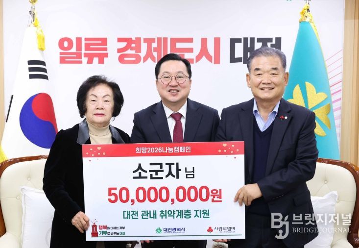 브릿지저널 정보영 기자 | 대전시는 15일 오전 시청 10층 응접실에서 아너소사이어티 회원인 소군자 기부자(124호)로부터 대전사회복지공동모금회를 통해 관내 취약계층 지원을 위한 성금 5천만 원을 전달받았다.