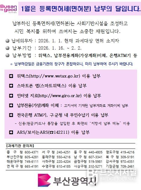 브릿지저널 윤나영 기자 | 부산시는 2026년 정기분 등록면허세(면허분) 총 43만여 건, 142억 원을 부과했다고 밝혔다.
