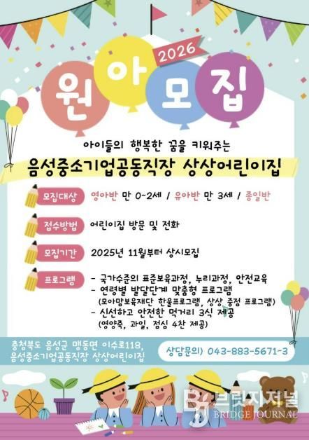 브릿지저널 김경미 기자 | 음성군은 중소기업 근로자의 보육환경 개선과 일·가정 양립 문화 확산을 위해 운영 중인 중소기업 공동직장어린이집 ‘상상어린이집’의 원아를 모집한다.