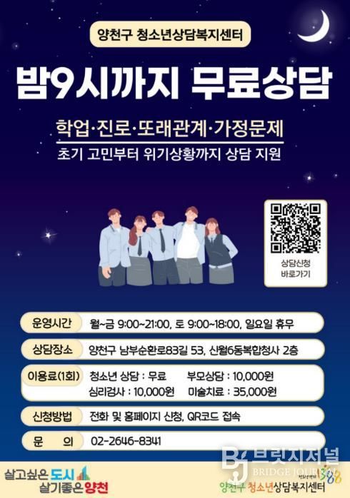 브릿지저널 김경미 기자 | 양천구가 심리적·정서적 어려움을 겪고 있는 청소년의 건강한 성장을 돕기 위해 마음건강 지원 강화에 나섰다. 올해부터 청소년상담복지센터 개인상담 서비스를 전면 무료화하고, 평일 밤 9시까지 연장 운영에 돌입한다.