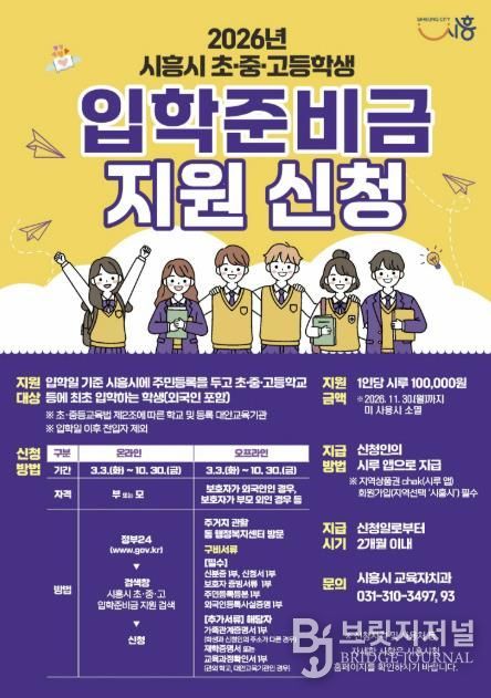 브릿지저널 김경미 기자 | 시흥시는 올해부터 관내 초중고 입학 자녀 가정에 입학준비금을 10만 원씩 지원한다. 이번 지원은 도서나 문구류 등을 새로 마련해야 하는 신입생 가정의 경제적 부담을 줄여주고, 교육 기본권을 강화하고자 추진됐다.