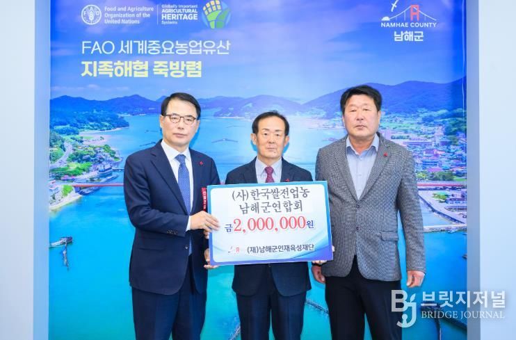 브릿지저널 김경미 기자 | (재)남해군인재육성재단은 이철세 서면노인회 분회장, 중현떡집, 금송운수, (사)한국쌀전업농남해군연합회에서 인재육성기금을 기탁했다고 밝혔다.