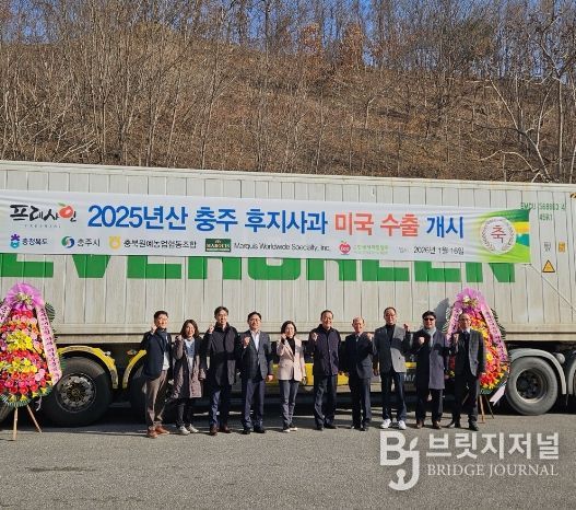브릿지저널 김경미 기자 | 충주시는 충북원예농협 충주거점산지유통센터를 통해 충주사과를 미국으로 수출하는 선적식을 16일 개최했다.